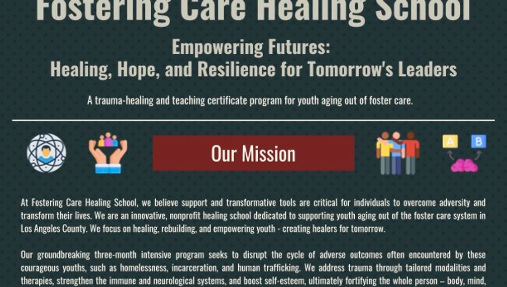Fostering Care: We Are Healing the Healers of Tomorrow. Fostering Care: the first 90-day, trauma-healing and healing trade intensive for youth ages 18-21, “aging out” of the foster care system. Each semester has a student body of 20 youth. The pilot semester is set to commence in Los Angeles County, 2024. Fostering Care believes that this unique demographic, due in no small part to their profound resilience, once safe, secure, and actualized, become powerful leaders and transformers.
